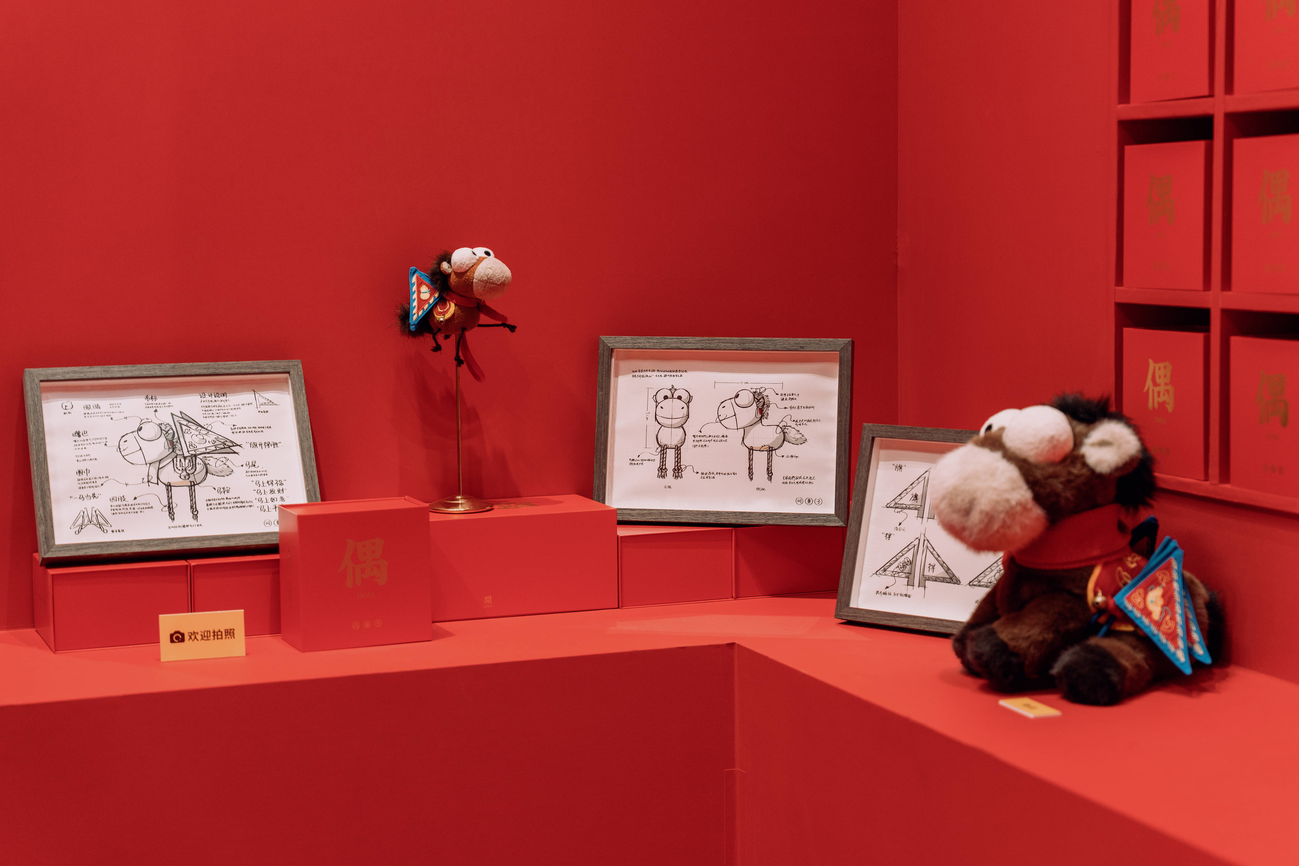 在整个展馆内,问童子“红”的显眼,整个红色空间一眼望去格外出挑,一进门就能看到“一马当先”的玩偶诞生过程,从多次修改的设计稿、到精密排布的几十块裁片、多种材质面料、再到最终成品,每一步都让大家直观了解到制作工艺的专业度与精细度。