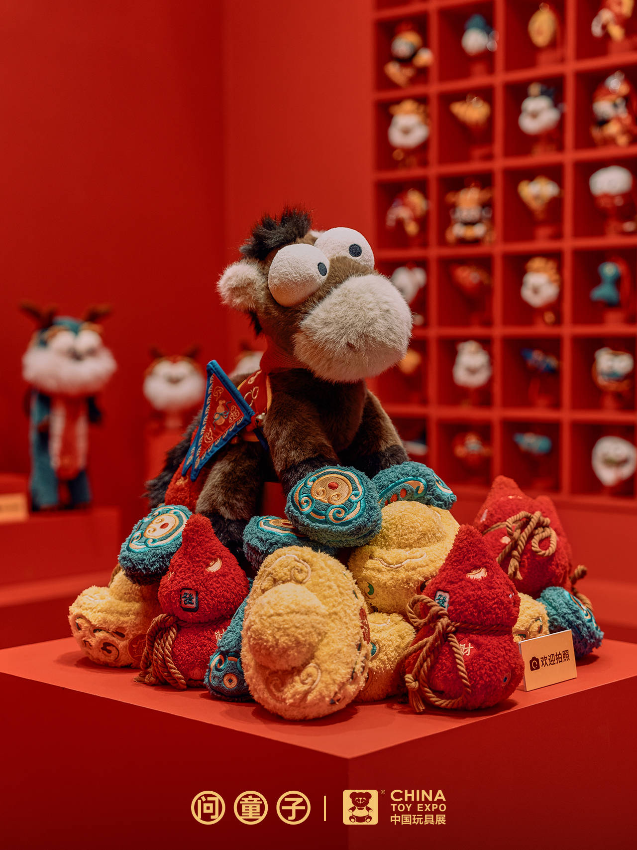 此次CTE现场,问童子也是带来了年度重头戏——马年生肖玩偶“一马当先系列”。近年来,问童子在生肖玩偶这条路上一骑绝尘,23年一只头大身小反差萌的“龙头老大”火遍大街小巷,24年凭借载满祥瑞又能凹造型互动的“中华地头蛇”俘获一众年轻人,今年,在配色上取丙午赤马年的红棕色,形象上延续了标志性的立体大眼,更是从中国传统戏剧文化中的武将装束上找到灵感,加入靠旗设计,四面旗子上绣着元宝、如意、蝙蝠、葫芦,打造出兼具传统气度又不失时代新意的马玩偶形象,也给大家带去美好祝愿,愿好运一马当先,万事旗开得胜;